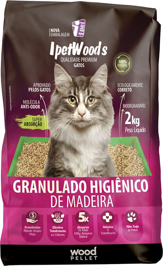 Este pacote contém 2kg de granulado de madeira da marca Ipet Woods. A composição é 100% natural, derivada de madeira de pinus. O uso é indicado para felinos de todos os portes e idades, além de roedores e coelhos.
