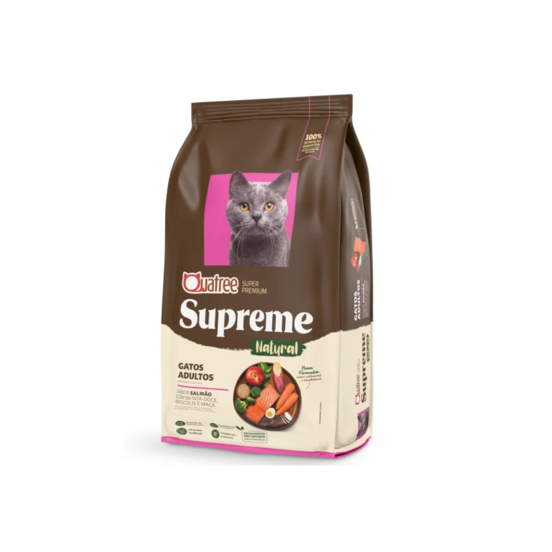 Proporcione ao seu felino uma experiência de sabor inigualável e a nutrição de excelência que ele merece! A Quatree Supreme Gatos Adultos Sabor Salmão é um alimento de categoria Super Premium, desenvolvido cuidadosamente para atender a todas as exigências nutricionais dos gatos na fase adulta.